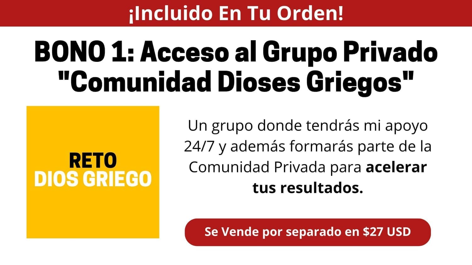 Bono #1: Acceso al Grupo Privado "Comunidad Dioses Griegos" - Un grupo donde tendrás mi apoyo 24/7 y además formarás parte de la Comunidad Privada para acelerar tus resultados. Estarás acompañado y guiado 24/7 para tu transformación acelerada.