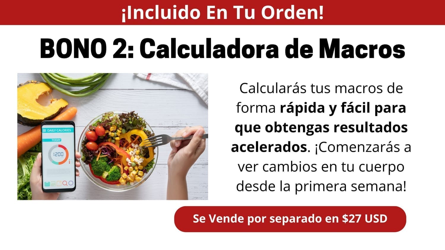 Bono #2: Calculadora de Macros - Calcularás tus macros de forma rápida y fácil para que obtengas resultados acelerados. ¡Comenzarás a ver cambios en tu cuerpo desde la primera semana!
